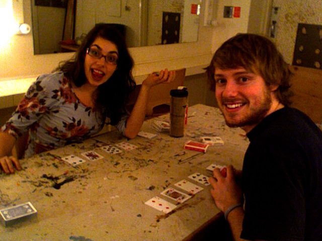 1:39 PM: Many of us have long breaks in the play, and cue to cue makes this even more evident – so we’ve developed a bit of a card game obsession. You can count on seeing us going nuts, yelling and pounding the